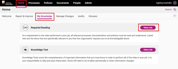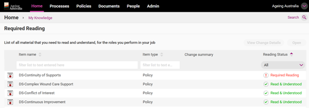 Note: If you navigate to Items in another way (e.g. using Search) you may also get an alert if that Item is assigned as Required Reading for your Role.