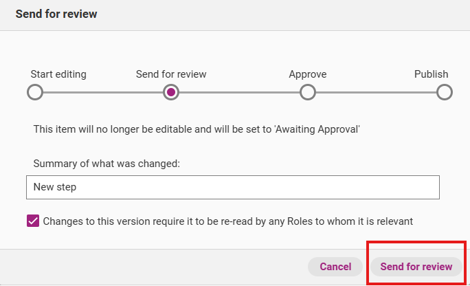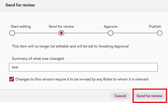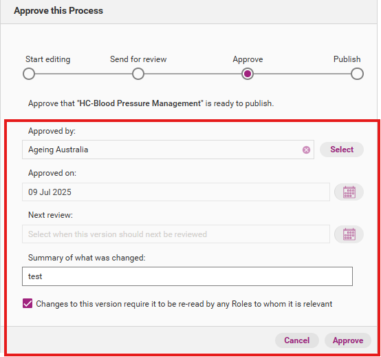 When you click Approve, a release management workflow appears. You can edit the summary of what you changed. You also have the option to select who approved the item, the date on which it was approved as well as the next review date.