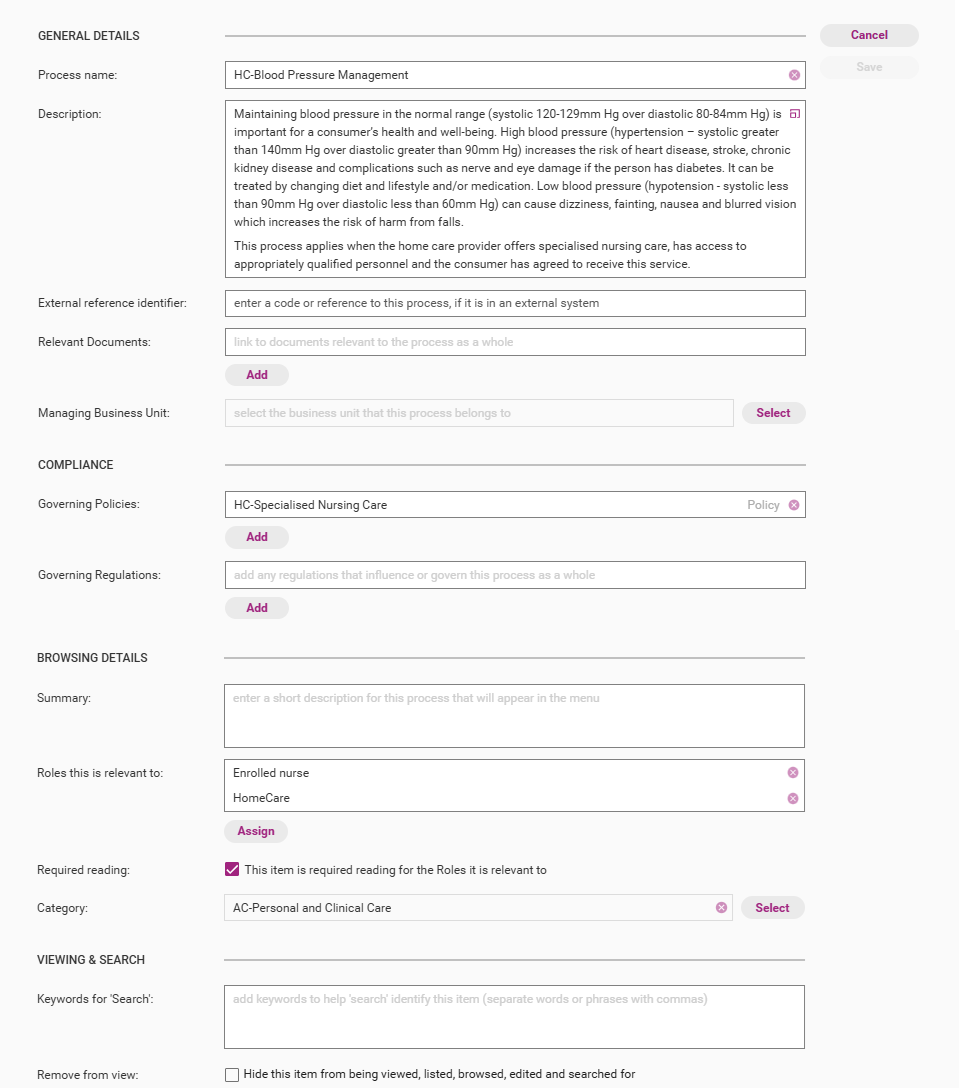 Roles this is relevant to | The work roles and people to which the process is related (e.g. Support Worker) (note this only needs to be updated if you intend to set the process as required reading for those roles. Refer to Assign Required Reading page for more information) |