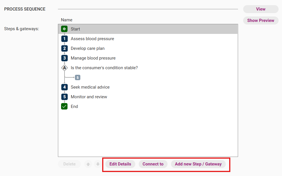 - Change the connections between steps and decision points using Connect to