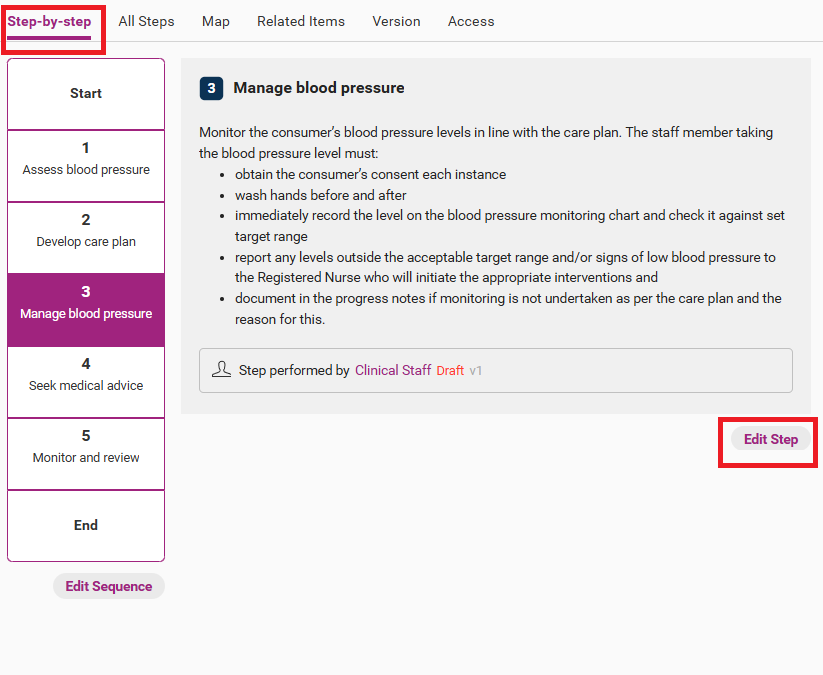 - Step-by-step view – click on the step you wish to edit, then edit step can be found underneath the step’s text.
