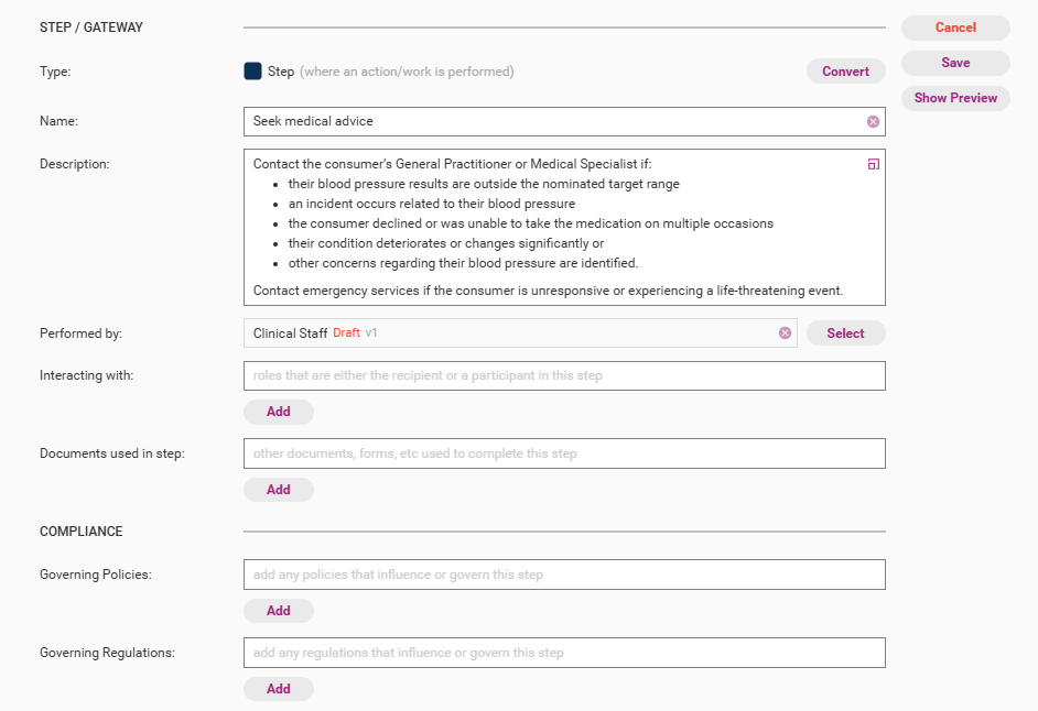 Performed by | Roles, organisations and/or people that are responsible for the step. This is a compulsory field. Refer to Create New Role for more details. |