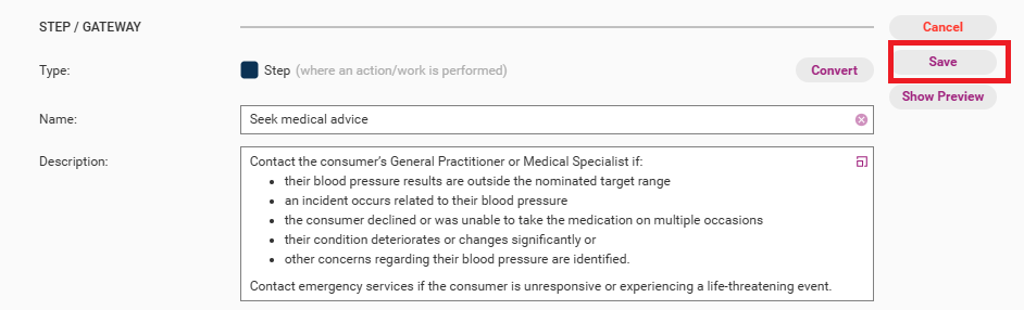 The edit step page will open with various editable fields. The table below summarises each field. Click into each field to make edits as required.