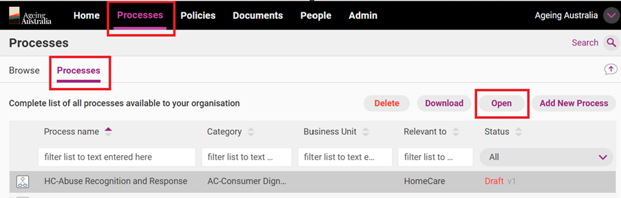 To open a process, access the Processes tab and click the Processes subtab, select the process you want to edit and click Open.