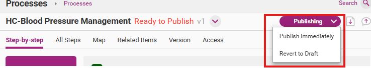 After you have approved the new process version, it will be marked ‘Ready to Publish’. You can now publish it as the latest version of that process. You also have the option to revert the process to a draft.