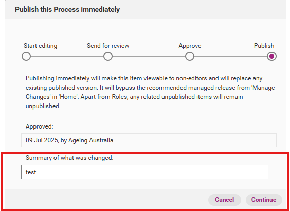 When you confirm publication, a release management workflow appears. You have the option to edit the summary of what was changed.