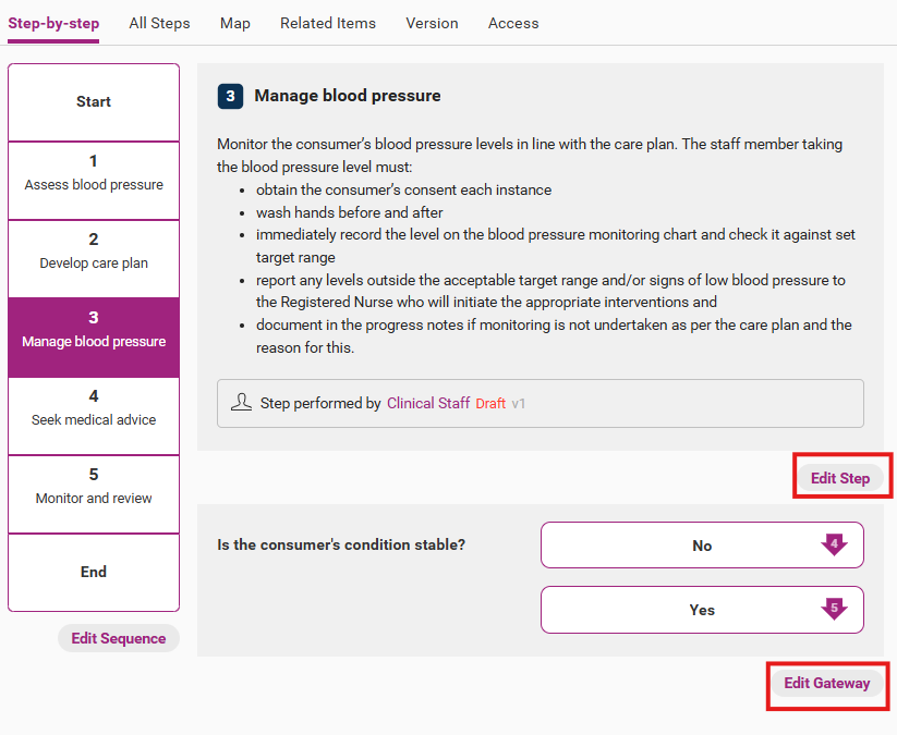 When you view one of the steps, you will also get the option to view edit a step. If the step is followed by a gateway point (as shown below), you will also get the option to edit a gateway point.