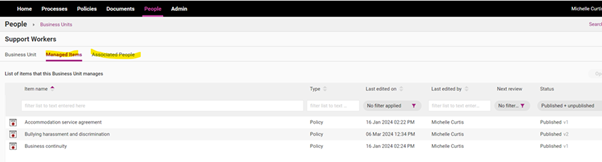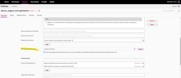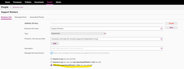 Edit all content items and assign your content to the relevant Business Units (example provided in policy and process screens). Please see Edit Policy guide for more details on this.