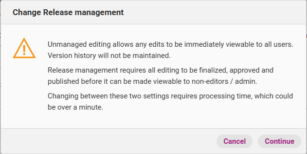 The following alert will pop-up when an Administrator attempts to change the Release Management settings. It will not be possible to change the setting if any content is not published (i.e. in draft, awaiting approval or awaiting publish).
