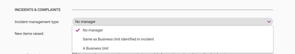 The Incident Management Type setting is used to determine what the Managing Business Unit will be for a Register Item. It is useful if the system is being set up to restrict visibility of Register Items.