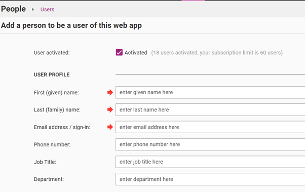 The only compulsory fields are shown using the red arrows and are First (given) name, Last (family) name and Email address/sign in.