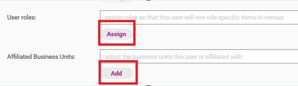 You can assign the User Roles and Affiliated Business Units by clicking Assign and/or Add.