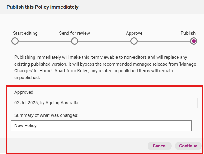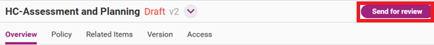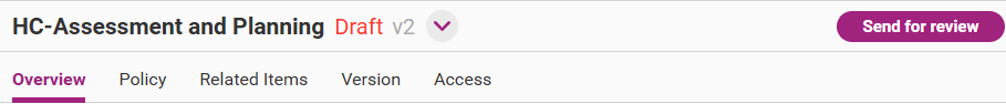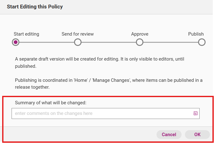 Once you start adding new content or updating existing content, you will automatically create a draft version of your selected policy/process/document/role. Before you start editing, you have the option to write a summary of what you intend to change.