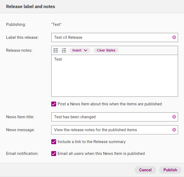 Email all users when this News Item is published | If selected, all QMS users in your organisation (provided they have activated their account) will receive an email notification about the release at 5:30am AEDT/AEST the following day. |