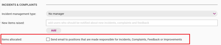 The Items allocated tick box directs the QMS to email Users who are assigned specific Positions when those positions are made responsible for Register Items. Note, the email notification will arrive after a few hours delay.