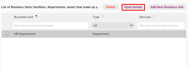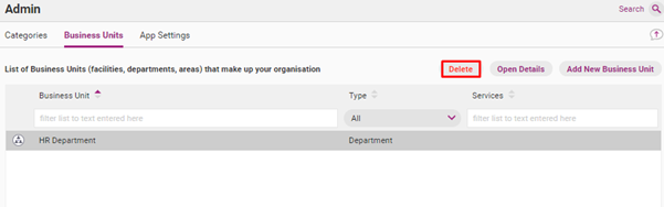 If a business unit has been made in error and not yet been used for register items, it can deleted as follows.