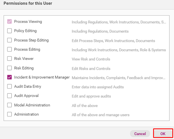 Administrators and Model Administrator automatically have the Incident and Improvement Manager functions.