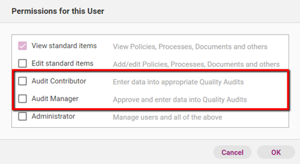 If you have access to internal audit you will have two additional user permissions: Audit Contributor and Audit Manager. Existing Administrators and Audit Managers can assign these roles on a user-by-user basis.