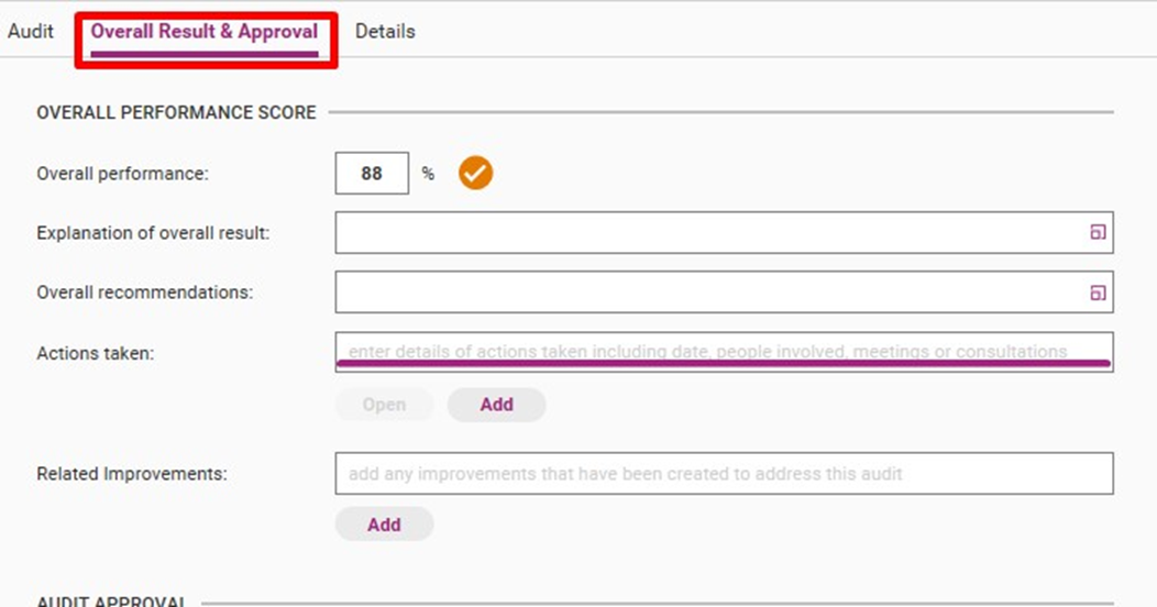 After you have uploaded the completed internal audit form, you can write comments and approve it. Once an audit has been approved, the scores are finalised.