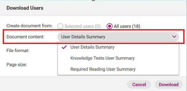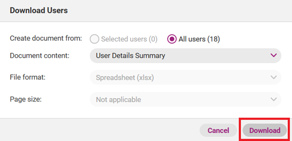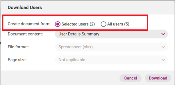 A pop-up Download Users box will emerge. Determine what Users you wish to include in the report by selecting the preferred option in the Create document from section.