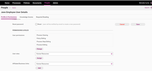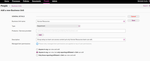 Organisation Problem: We require all staff to view content around Human Resources yet do not want everyone with ‘editing permissions’ in their user account to be able to modify these documents. Only the delegated Human resources team members with editing permissions and assigned to this business unit should be able to update these items.